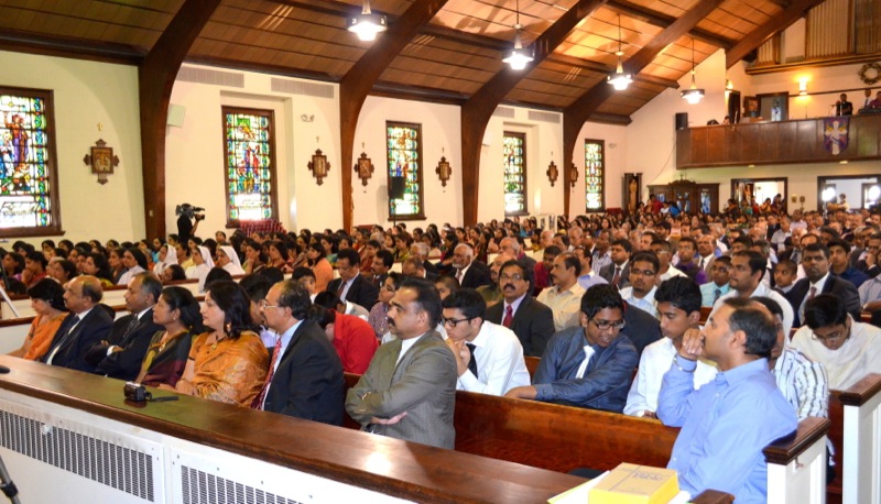 The Syro-Malankara Catholic Exarchate in USA accorded a very warm and cordial official welcome to the Head and Father of the Syro-Malankara Catholic Church His Beatitude Moran Mor Baselios Cardinal Cleemis Catholicos as he made his first visit to the Exarchate after becoming a Cardinal of the Universal Church. At 2.00 pm. on Sunday, May 12, 2013, around 700 Malankara Catholic Faithful, priests and religious received the new Cardinal and His Excellency Dr. Thomas Mar Eusebius to the Pro-Cathedral of the Exarchate in Elmont. Then the Cardinal, along with Bishop Eusebius and many priests celebrated a thanksgiving Holy Mass. The Holy Mass was followed by a short felicitation meeting. Msgr. Peter Kochery, the Vicar General of the Exarchate welcomed the gathering. Then, His Excellency Mar Eusebius and Mr. Philip John, secretary of the Exarchate Pastoral Council spoke felicitating the new Cardinal. Some of the distinguished guests came forward and conveyed their greetings to His Beatitude. The English translation of the book on Kilileth Chackochan, translated by his great grand daughter, Ms. Jilu Jacob was released by His Beatitude and was given to His Excellency Mar Eusebius. This was followed by the sharing by His Beatitude. Mrs. Jeny Sunil compered the program. The meeting was followed by agape.
