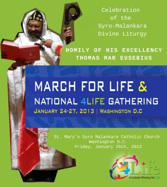 We have gathered here to participate in a historic event, to proclaim our solidarity with all our brothers and sisters in this country who are radically committed to the most fundamental aspect of our Christian call, namely the protection and promotion of human life. We have gathered here as members of the Syro-Malabar and Syro-Malankara Churches in the US. As Syro-Malabar and Syro-Malankara Catholic Faithful we share a common heritage; our rootedness in the ancient Indian culture and in the ancient Eastern Christian spirituality of the Syriac tradition is common. The values that we have inherited from these two sources should continue to inspire and influence our Christian commitment in the American society. And as we know, family, marriage and respect for life are values fundamental to the cultures that we have inherited and they constitute the basis of our Christian faith as well. Today we wish to reiterate our uncompromising commitment to these values, especially our stand on the issue of life, that we are committed to respecting and protecting life. That is the reason why we have gathered here.