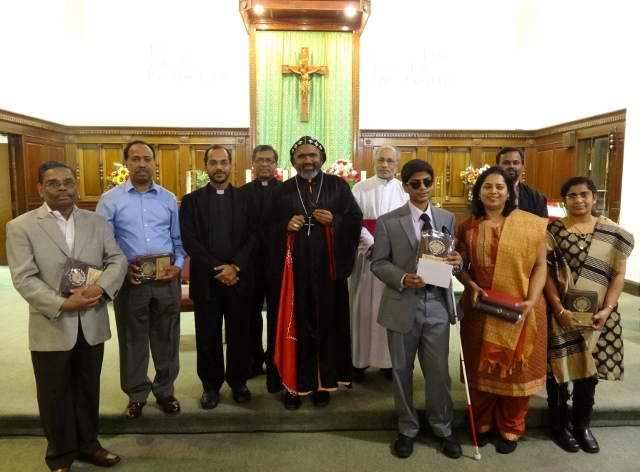The Year of Faith celebration of the Exarchate was concluded with an adoration to the Blessed Sacrament on November 23 at the St. Vincent de Paul church, Elmont. During the adoration Rev. Dr. Mathew Manakattu, former President of the Paurasthya Vidyapeetam, Kottayam shared reflections on how we have to carry forward the spirit of the Year of Faith. After the Holy Hour, prizes for the winners of the Year of Faith Bible Quiz competition were distributed. His Excellency Thomas Mar Eusebius officiated the prize distribution ceremony. The newly prepared English translation of the Sunday Prayers was released by His Excellency and the copy was given to Rt. Rev. Msgr. Peter Kochery. On this occasion, the 70th birthday of Rt. Rev. Msgr. Peter Kochery and the 60th birthday of Very Rev. Fr. Augustine Mangalath also were celebrated. His Excellency Mar Eusebius, Rev. Dr. Sunny Mathew and Mr. Philip John (Secretary, Pastoral Council) offered felicitations. The celebration concluded with agape.