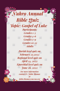 The Eparchial Bible Quiz will be part of the Faith Formation program. It will be conducted at three levels (Parish, Regional and Eparchial levels) for various age groups. The Nuhro 2022 Bible Quiz will be conducted online at all levels. The Quiz Questions for the Adult group will be given in Malayalam based on the POC Malayalam Bible. The Malayalam quiz option is only available to the adult group. The English Bible Quiz is based on The New American Bible, Revised Edition (NABRE).