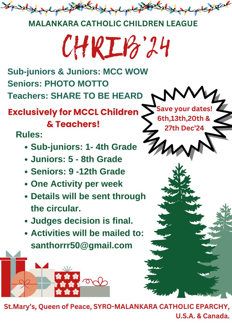 The Malankara Catholic Children League (MCCL) invites all children and teachers to participate in CHRIB'24, a joyous and engaging Christmas activity series. This program is specially designed to nurture creativity, spirituality, and festive cheer!